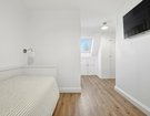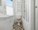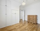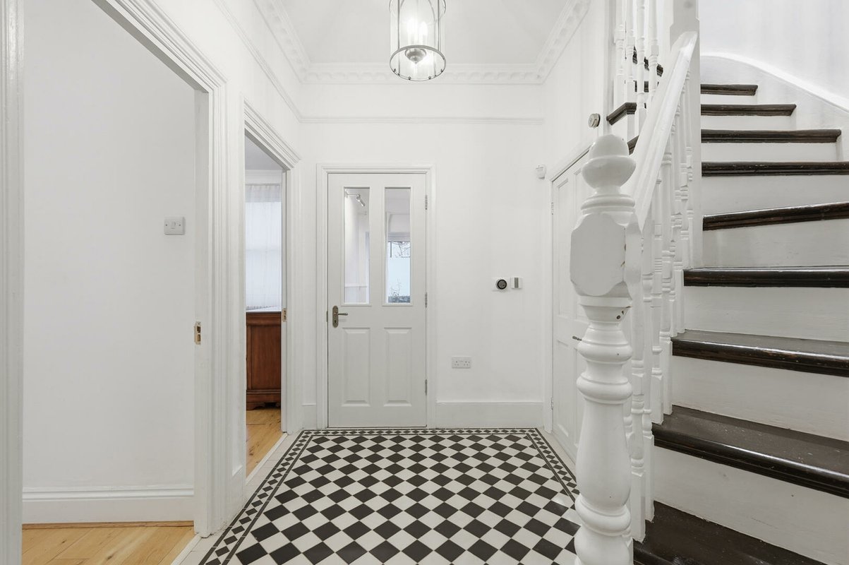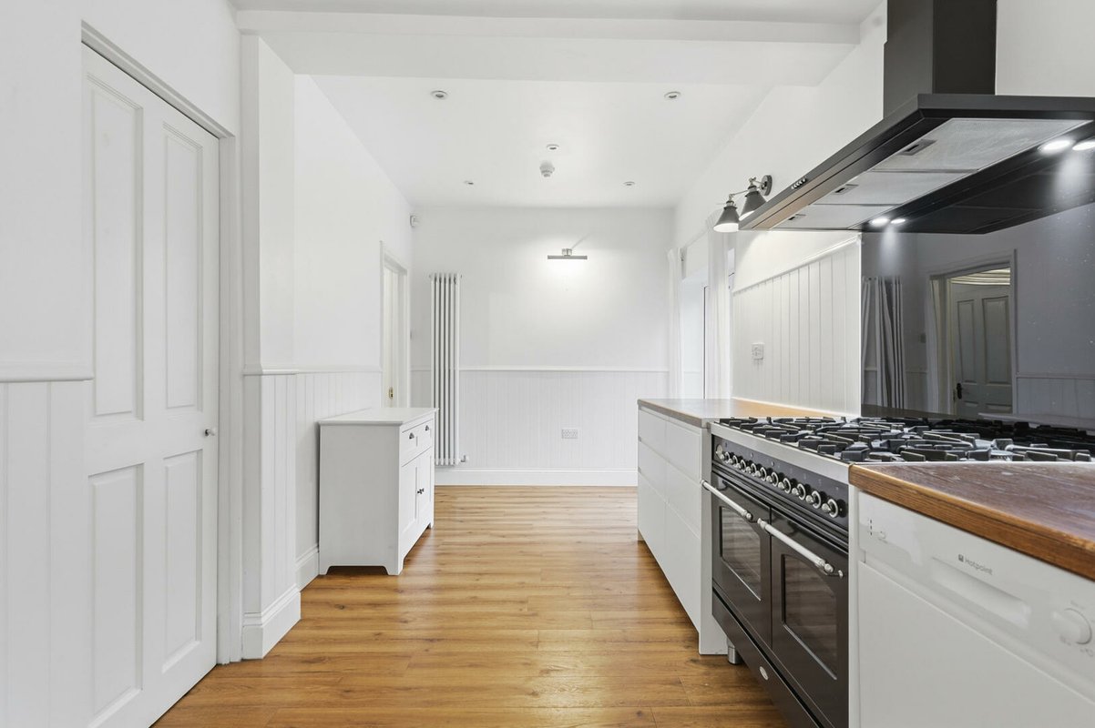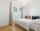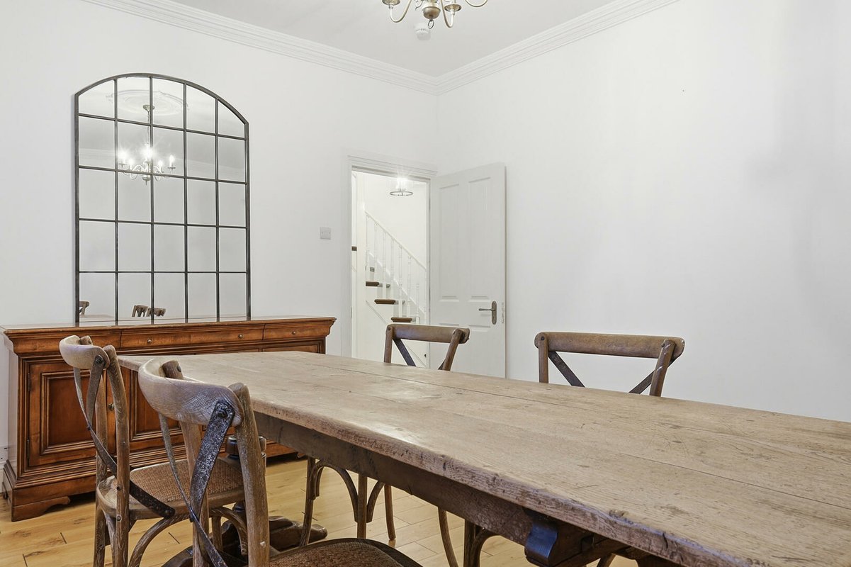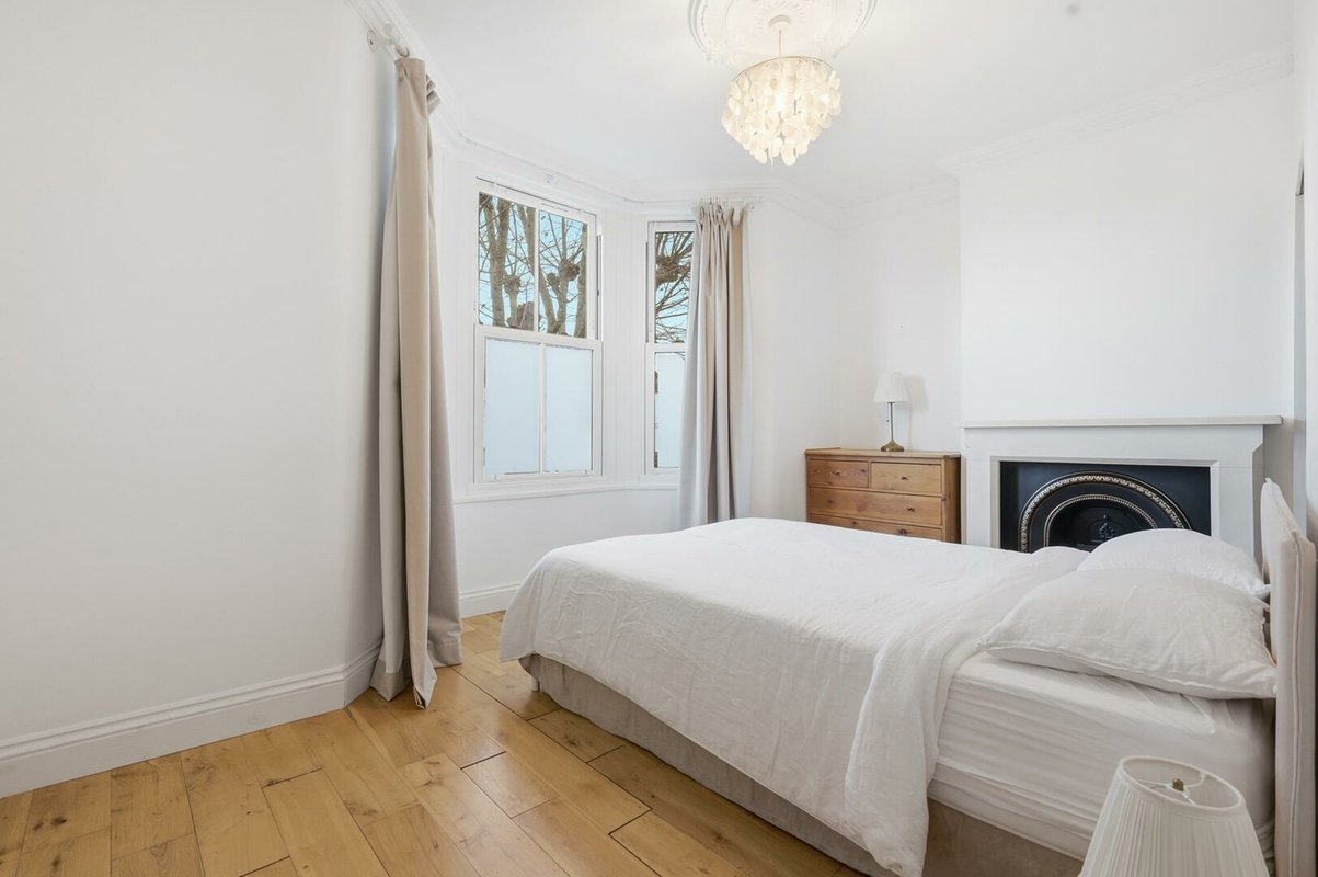 The first floor offers three well-proportioned bedrooms. The largest bedroom boasts a bay window and a walk-in wardrobe, while another bedroom enjoys dual-aspect windows and integrated double wardrobe. A stylish family bathroom with a period-inspired white suite, half-height weatherboarding, and Minton-style flooring completes this level. The top floor hosts two further generous double bedrooms, each with excellent built-in storage. One benefits from its own en-suite shower room, finished with the same thoughtful period detailing as the main bathroom.