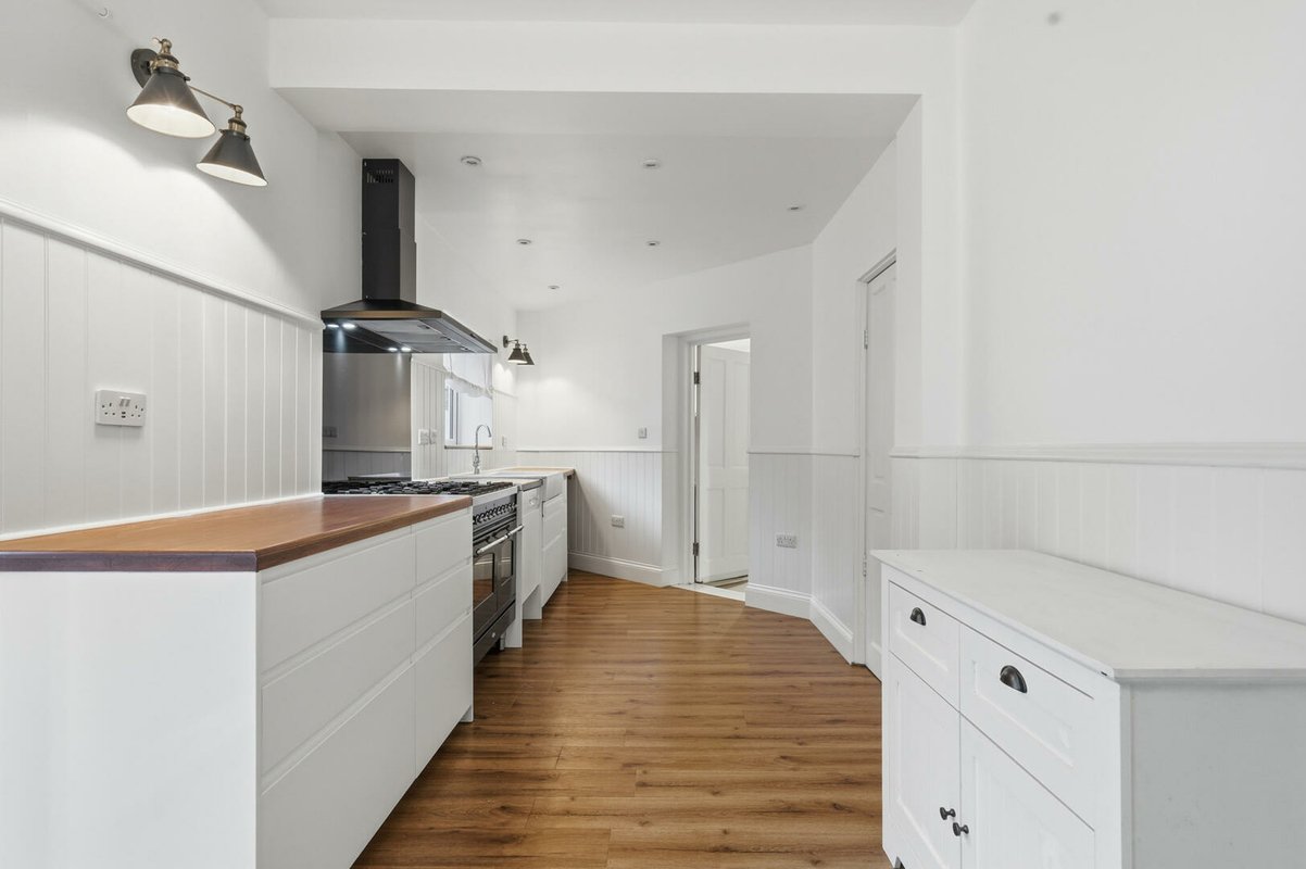Inside, the home is beautifully presented and move-in ready, with a crisp white colour palette, a blend of wooden and decorative tiled flooring, double-glazed sash windows, and elegant period radiators throughout. A welcoming porch with fitted storage leads into the first of two generous formal reception rooms, complete with a bay window and an attractive central fireplace. The second reception, ideal as a spacious, formal dining room, flows seamlessly from the wide, characterful entrance hall. To the rear, the impressive 22'8 wide kitchen-dining room features wooden worktops, weatherboard detailing, range cooker, and twin butler sink. A pantry cupboard and a dedicated utility room, leading to a sleek wet room with oversized rainfall shower and recessed controls, provide exceptional practicality. Additional storage is available in the cellar, accessed via the ground-floor staircase.