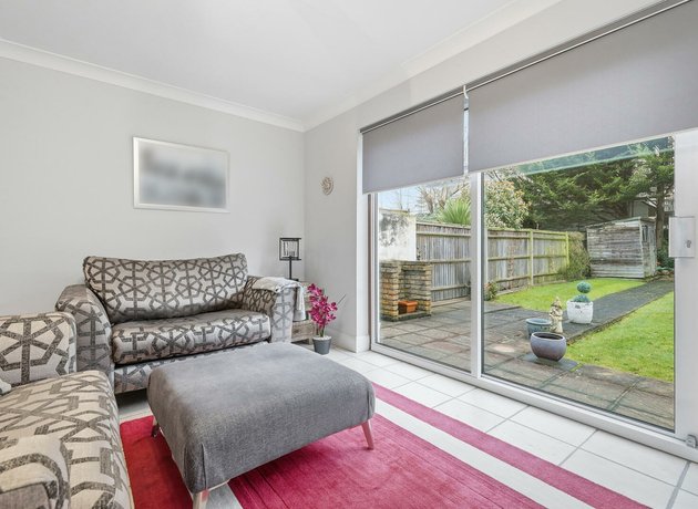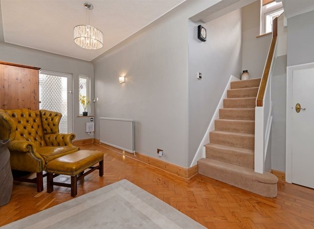 The welcoming hallway boasts beautiful parquet flooring, which seamlessly flows through the main living spaces. To the front of the house, the elegant dining room is ideal for hosting dinner parties or enjoying a Sunday lunch with loved ones. At the rear of the property, the spacious reception room is bathed in natural light, thanks to full-length sliding doors that open out onto the stunning rear garden—creating a seamless connection with the outdoors.