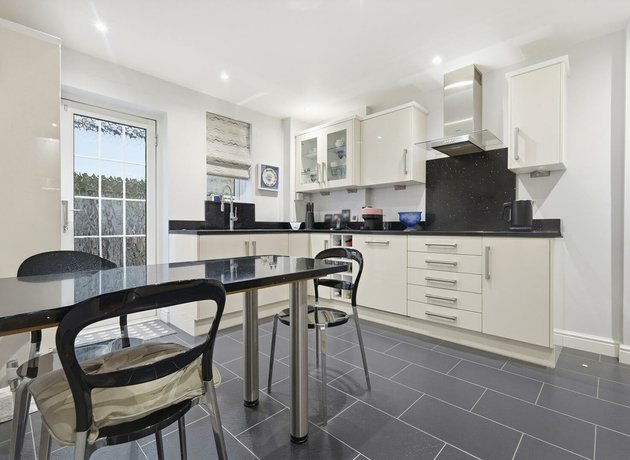 The immaculate kitchen/breakfast room features a range of sleek cabinets, integrated appliances, under-cabinet lighting, granite worktops and a convenient breakfast bar—perfect for casual meals or enjoying your morning coffee. The stylish white cabinetry pairs beautifully with the dark work surfaces, creating a modern and sophisticated feel. Adjacent to the kitchen, the cozy yet spacious sitting room offers the ideal spot to unwind after a long day, complete with a view of the lovely garden. The ground floor is completed by an integral garage and downstairs w.c.