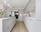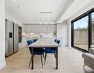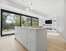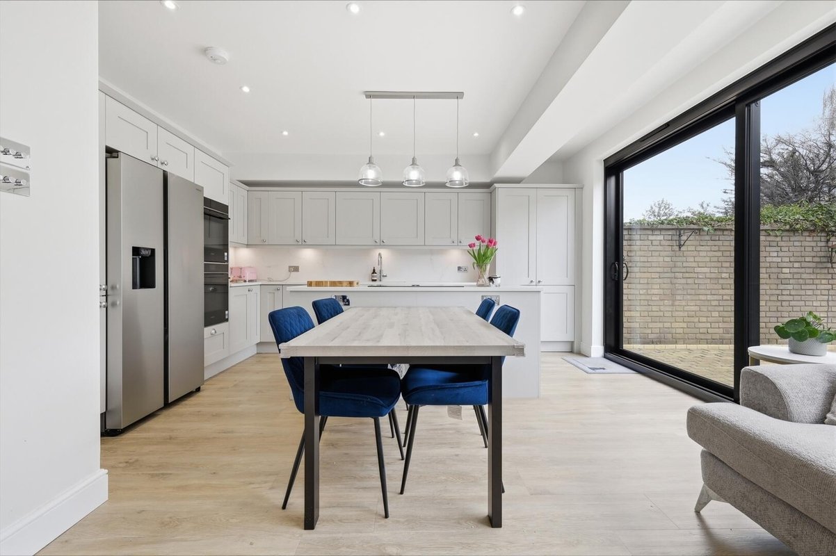 To the rear, the home truly comes into its own. The stunning open-plan kitchen, dining and family space has been thoughtfully designed for modern living, whether hosting friends, gathering with family, or simply enjoying day-to-day life. Sliding doors open seamlessly onto a raised patio, creating a natural flow between inside and out, ideal for summer dining and relaxed evenings. The shaker-style kitchen, finished in elegant light grey with marble worktops and a statement island, forms the centrepiece of this sociable space.