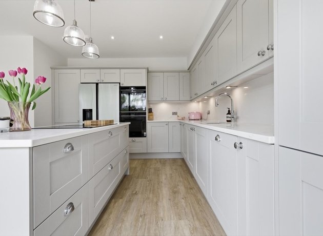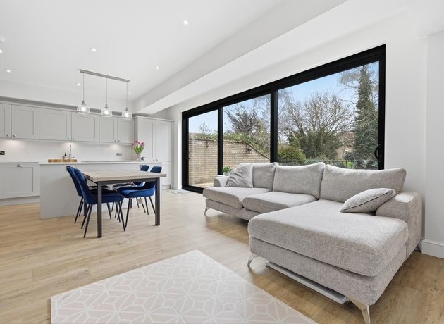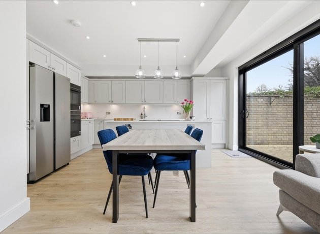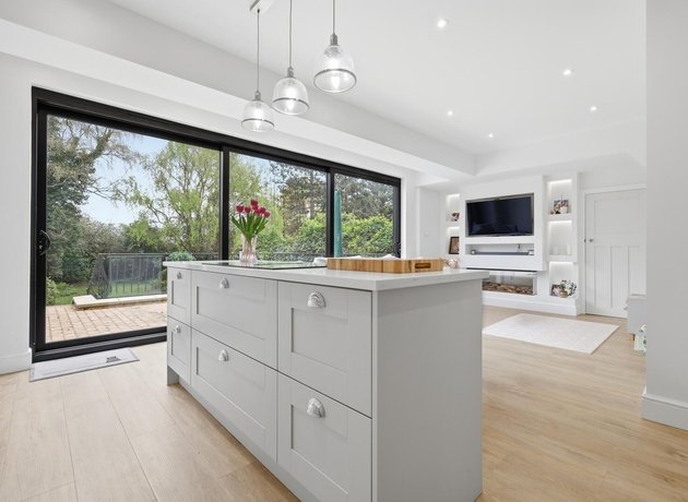 To the rear, the home truly comes into its own. The stunning open-plan kitchen, dining and family space has been thoughtfully designed for modern living, whether hosting friends, gathering with family, or simply enjoying day-to-day life. Sliding doors open seamlessly onto a raised patio, creating a natural flow between inside and out, ideal for summer dining and relaxed evenings. The shaker-style kitchen, finished in elegant light grey with marble worktops and a statement island, forms the centrepiece of this sociable space.