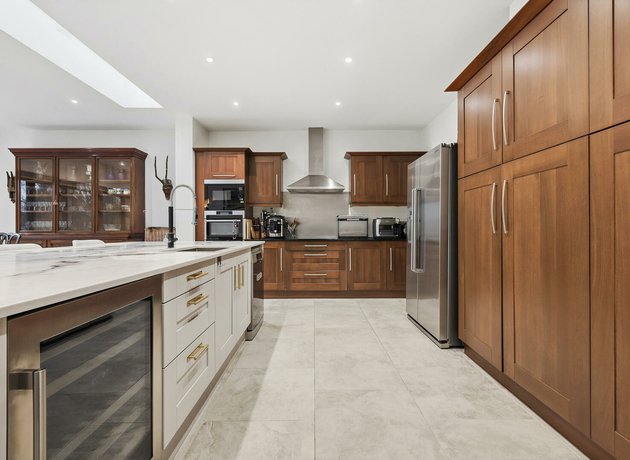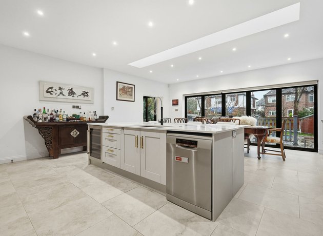 Internally, the house is defined by its generous proportions and high ceilings. Accommodation begins with an entrance porch leading into an equally impressive reception hall, with a home office immediately accessible. The expansive family kitchen/dining room has also been extended to an impressive 20 ft × 21 ft 4 in, creating a highly functional and sociable space at the heart of the home. A recently installed central island forms the focal point of this naturally light-filled room, enhanced by bi-fold doors and a large overhead skylight. The island incorporates storage to both sides, a breakfast bar, dishwasher, drinks fridge, and sink. Surrounding cabinetry comfortably accommodates a large American-style fridge/freezer alongside a range of fitted appliances, while a separate utility room discreetly houses the noisier appliances and provides a secondary sink.