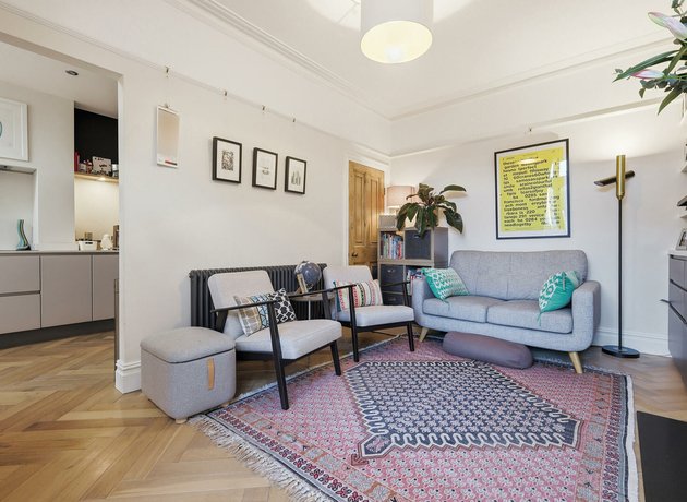 Inside, the ground floor is bright, fresh, and thoughtfully updated, with subtle nods to the home’s heritage throughout. The hallway, dressed in crisp white walls, features elegant blue patterned tiles that echo the property’s Edwardian roots. From here, you step into a serene front lounge, where lower wall panelling, picture rails, and exposed floorboards create warmth and character. Plantation shutters frame the beautiful bay window, whilst the original ornate fireplace, complete with a contemporary grey surround and mirror, anchors the room.