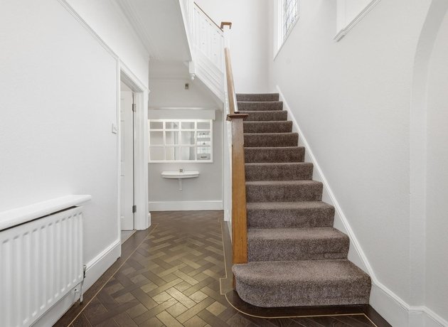 You are welcomed by a spacious and inviting entrance hall featuring high quality Amtico flooring and stunning original stained glass windows that offer a graceful nod to the home’s heritage alongside the original staircase banisters.