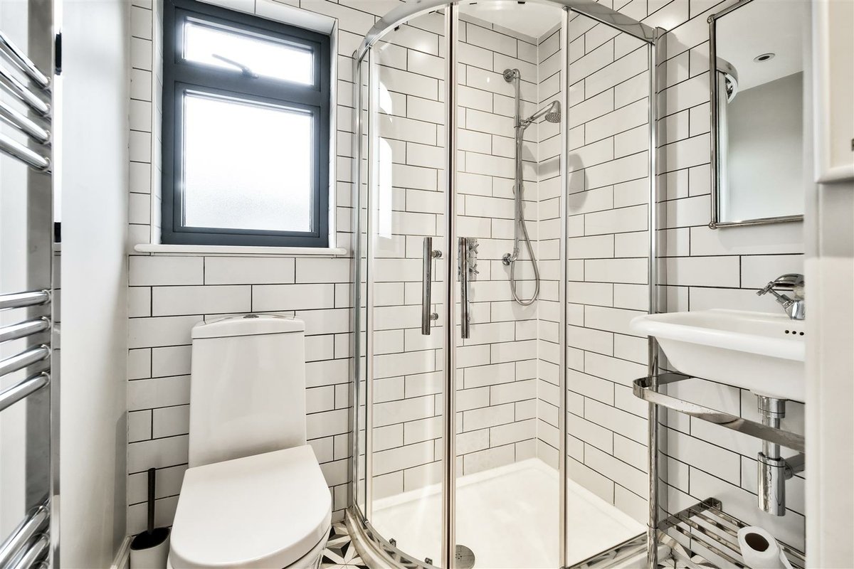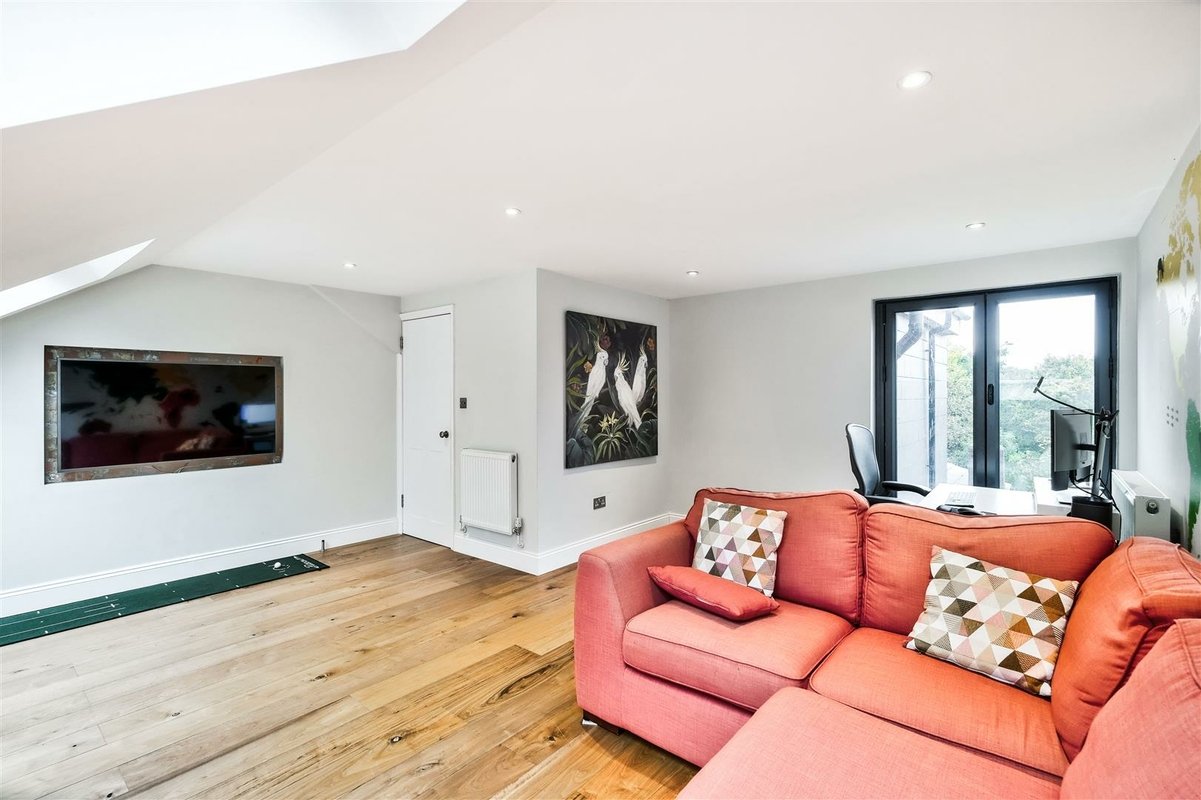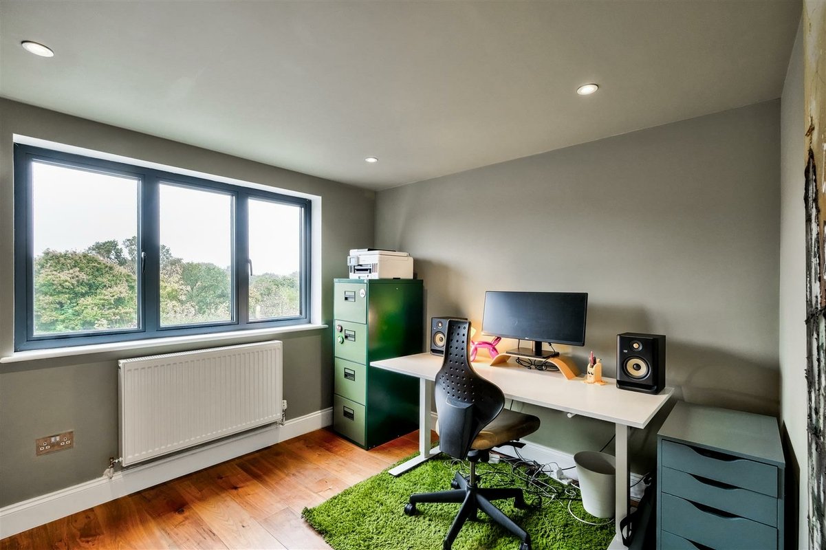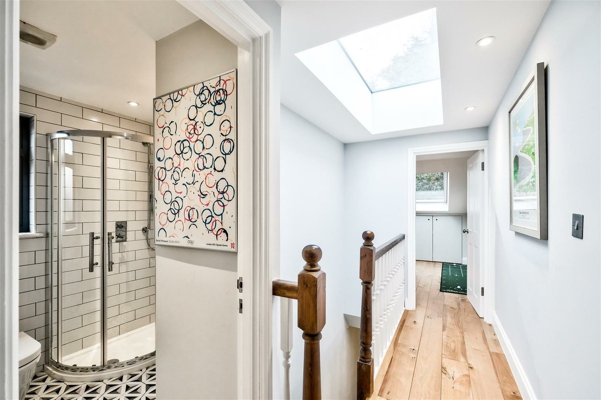 The second floor has been thoughtfully designed to maximize space and offers two well-proportioned double bedrooms, which are accessed by a landing illuminated by an overhead skylight, flooding the area with natural light. The front-facing bedroom features a charming Juliette balcony and provides a versatile space with generous eaves storage. It is currently arranged as a playroom and office. A modern shower room serves these second floor bedrooms, with the rear facing bedroom currently arranged as a home office, perfect for remote work.