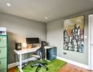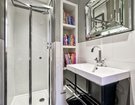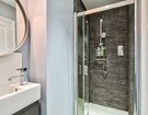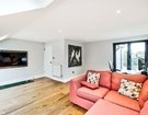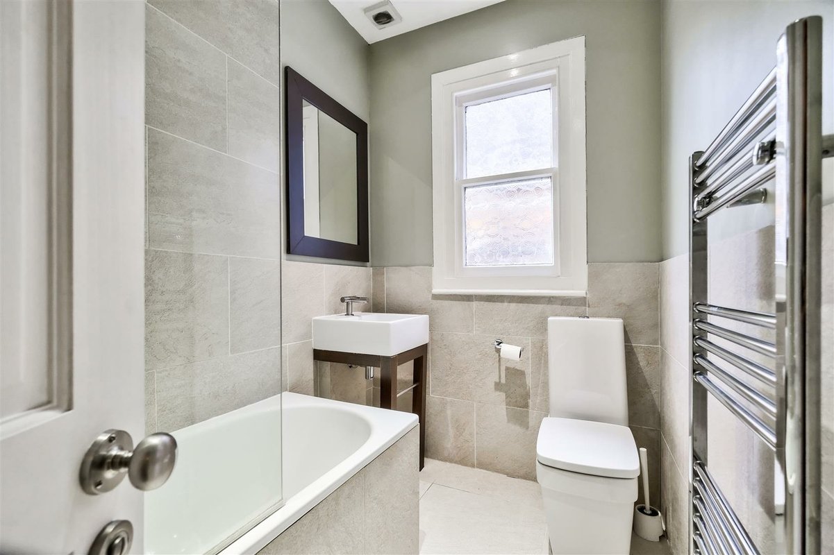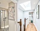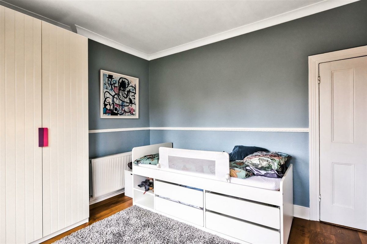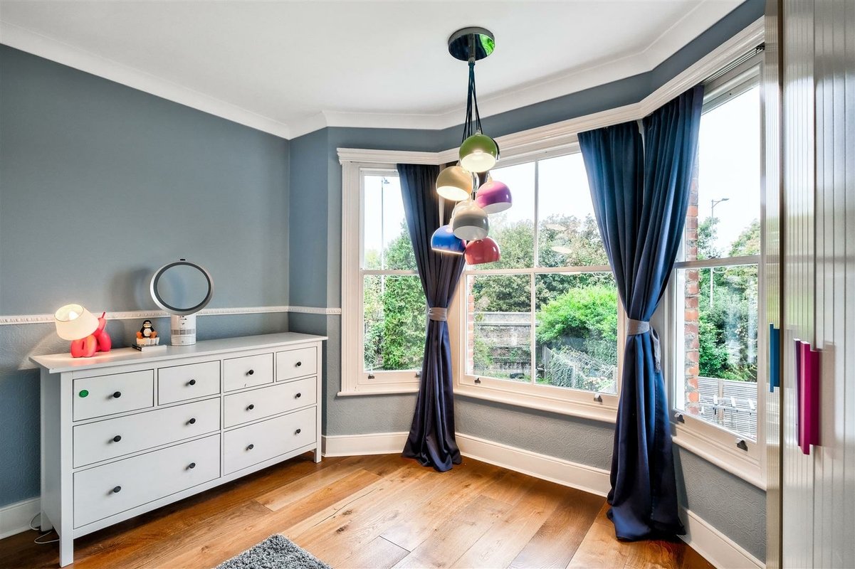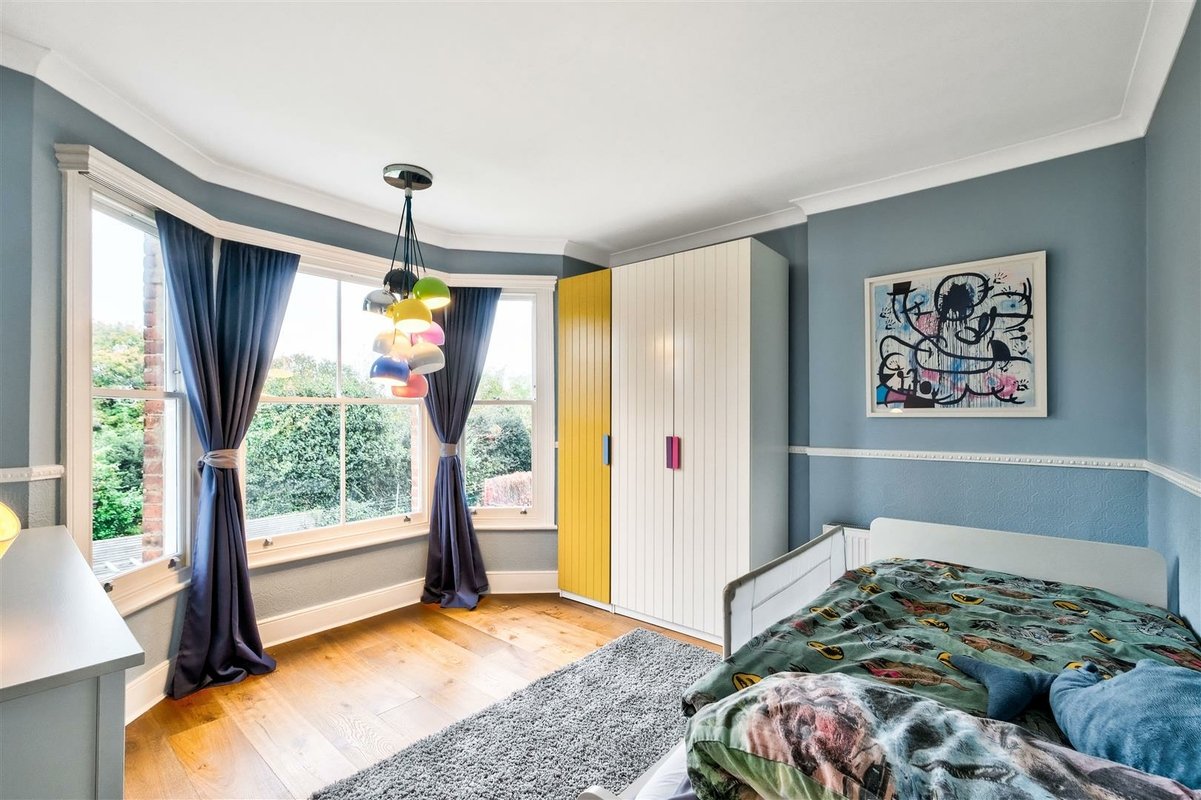 The second floor has been thoughtfully designed to maximize space and offers two well-proportioned double bedrooms, which are accessed by a landing illuminated by an overhead skylight, flooding the area with natural light. The front-facing bedroom features a charming Juliette balcony and provides a versatile space with generous eaves storage. It is currently arranged as a playroom and office. A modern shower room serves these second floor bedrooms, with the rear facing bedroom currently arranged as a home office, perfect for remote work.