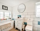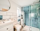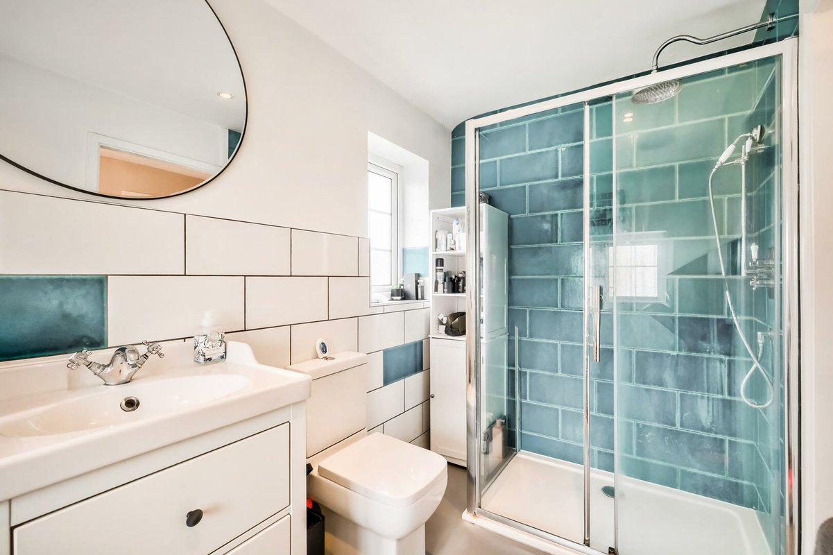 Upstairs, you’ll find three generous bedrooms, with the main bedroom including built-in wardrobes, offering plenty of storage without sacrificing style or space. The family bathroom is spacious and beautifully tiled and includes a separate tub for relaxing soaks and a large double shower. Crisp white tiles are accented with soft sea-blue details, giving the space a fresh, uplifting feel.