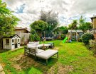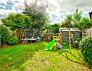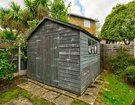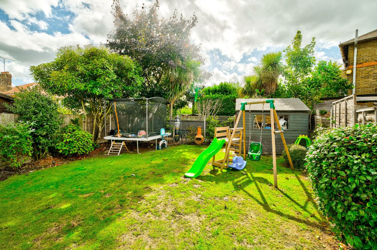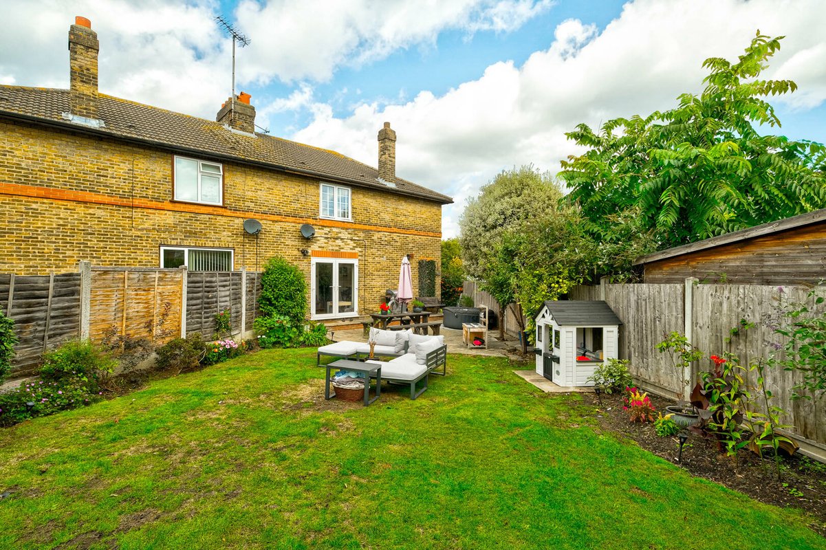 Outside, the rear garden has a paved patio area for outdoor dining, a lawn for the children to play on, and a shed tucked away for extra storage.