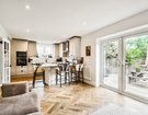 To the rear, the heart of the house unfolds: a stunning kitchen-diner that perfectly blends form and function. The kitchen is a real showstopper fitted with soft light grey shaker cabinets, black hardware, and a classic butler sink. Everything is finished to a high standard, from the sleek fittings to the warm walnut parquet flooring, which adds richness and texture to the space. A stylish breakfast bar offers the perfect spot for casual dining or morning coffee, subtly separating the kitchen from the dining area.