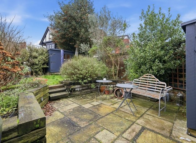 A South Westerly garden commences with a stone patio area, perfect for al-fresco dining in the summer months with plenty of space for a table and chairs. Railway sleeper retaining walls lead to the lawn, bordered by mature shrubs and trees, whilst a storage unit and garden shed provide a useful space for garden equipment.