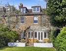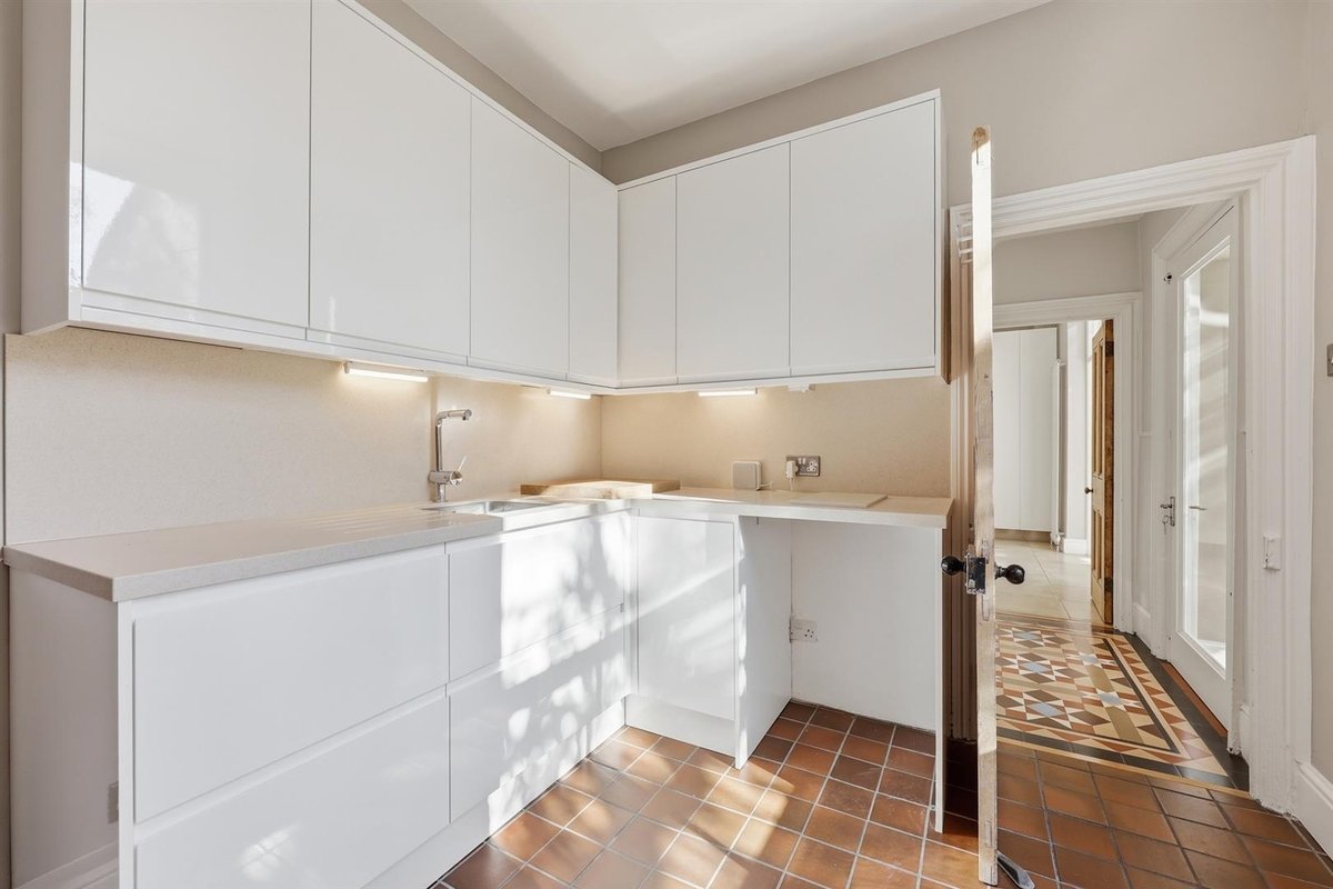 The kitchen has been thoughtfully designed with a peninsula island that connects effortlessly to the rear sunroom, allowing light to cascade in through expansive glazed doors and an overhead rooflight. This versatile space serves equally well as an additional dining or reception area, enjoying a desirable south-easterly aspect. A useful cellar is also accessible from this level. Positioned across the hallway from the kitchen, a stylish and well-proportioned utility room provides excellent additional practicality, complete with access to a discreetly appointed guest W.C.