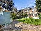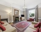 To the front, an elegant dining room sits opposite a generously proportioned formal sitting room, both enjoying deep bay windows with views across the park and featuring central fireplaces that provide charming focal points. The dining room opens into a beautifully appointed contemporary kitchen, fitted with sleek, handleless high-gloss Parapan units, complemented by Corian work surfaces and a large range cooker neatly recessed within the original chimney breast.
