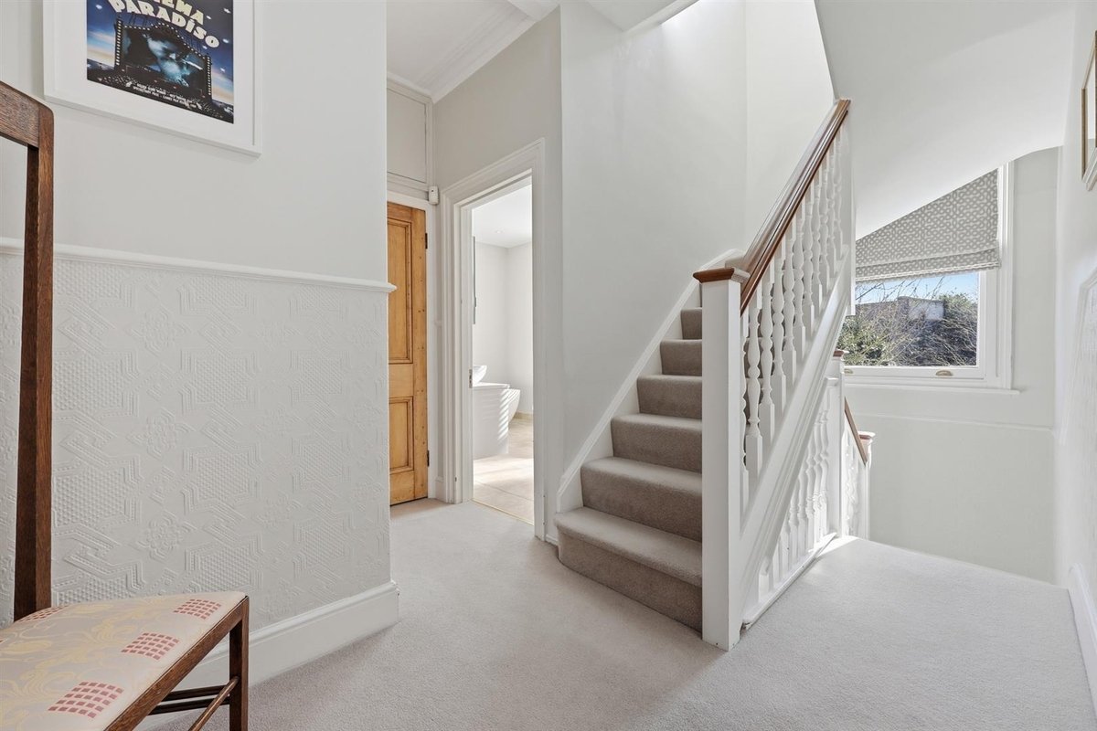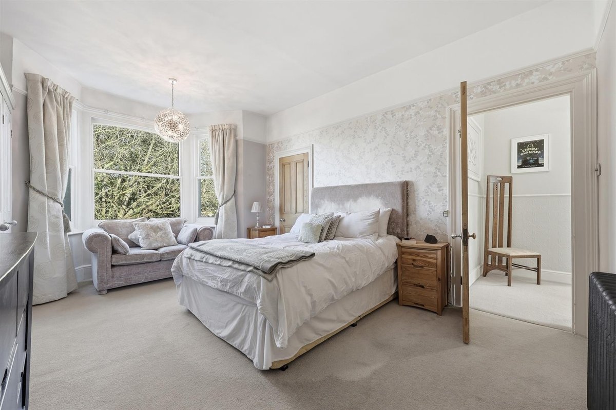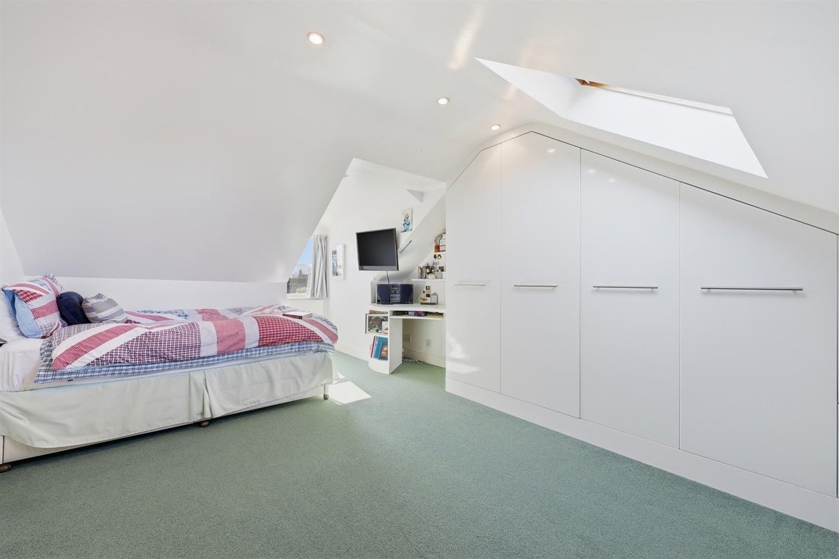 The first floor hosts three exceptionally spacious double bedrooms, all benefitting from built-in storage with the front bedrooms offering wonderful views of the park. The principal bedroom is particularly impressive, featuring an extended footprint thanks to the double-height bay window, and a generous en-suite shower room. A beautifully finished family bathroom completes this floor, featuring a centrally positioned freestanding bath, separate recessed shower and twin sash windows. The loft has been thoughtfully converted to provide two further rooms, both with useful eaves storage and served by a convenient Jack-and-Jill shower room & W.C, offering flexibility for additional bedrooms, guest accommodation or home working.