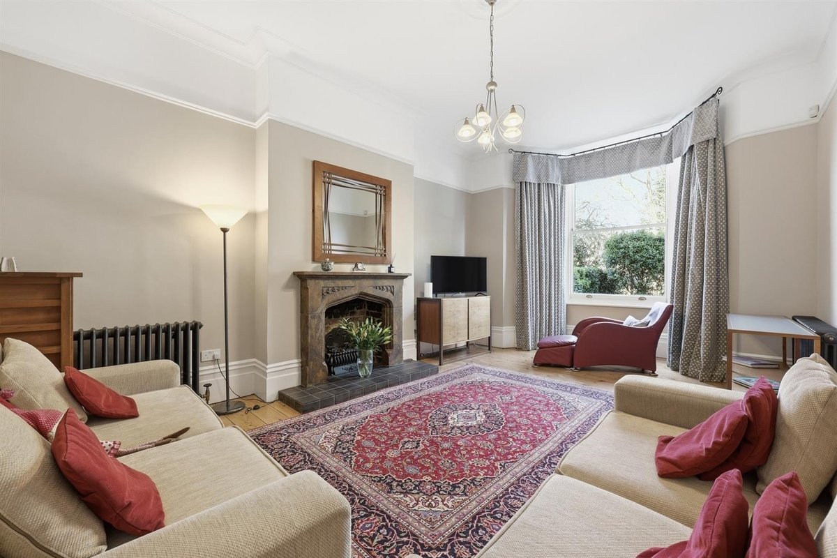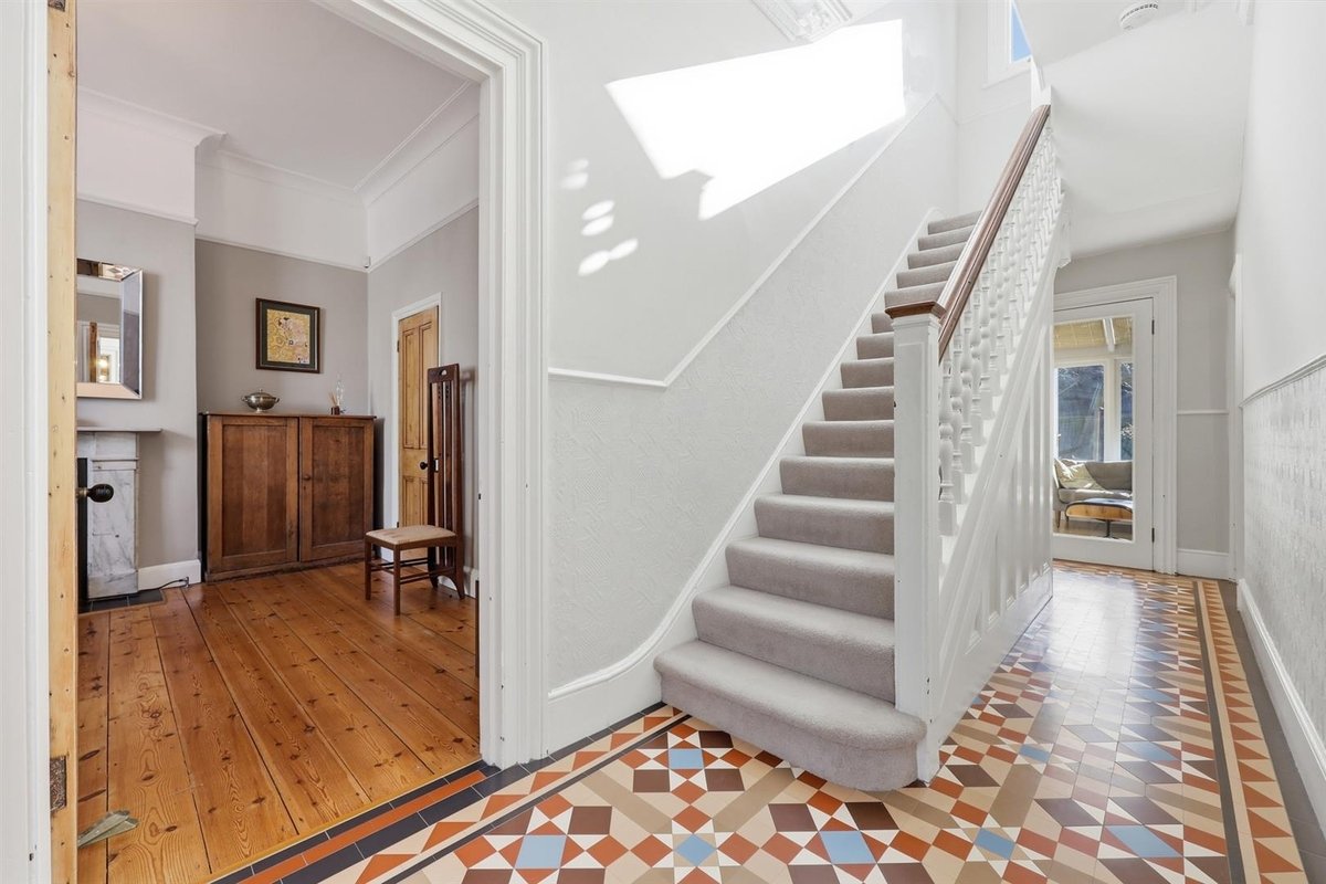 The elegance of the surroundings is beautifully echoed in the home’s distinguished façade. A grand, centrally positioned enclosed porch forms a striking focal point, flanked by wide bay windows – all edged by Intricate plaster detailing befitting a residence of such calibre. Upon entering, you are greeted by an impressive central hallway adorned with beautifully preserved Minton tiling, immediately setting the tone for the home’s period elegance. Natural light pours through a striking stairwell window and is further drawn in from the rear sunroom, which flows seamlessly from the hallway. Throughout, the property provides a wealth of character, original and reproduction, including cast iron radiators, exposed timber flooring, original sash windows and panelled doors, all enhanced by the home’s notably high ceilings and expansive windows, creating a wonderfully light and airy atmosphere.