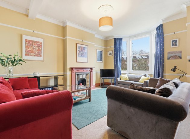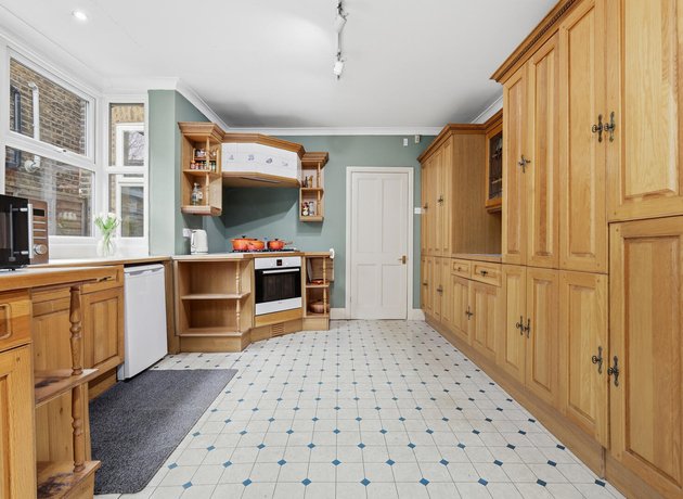 Inside, the beautifully proportioned through lounge and dining room is bathed in natural light from its double aspect windows, including a striking bay to the front. Original features enhance the sense of heritage, including a characterful fireplace with delicate pastel tiled detailing, complemented by picture rails and dado rails that pay homage to the home’s Victorian origins. The room provides an elegant yet comfortable setting, perfectly suited to both relaxed family living and refined entertaining.