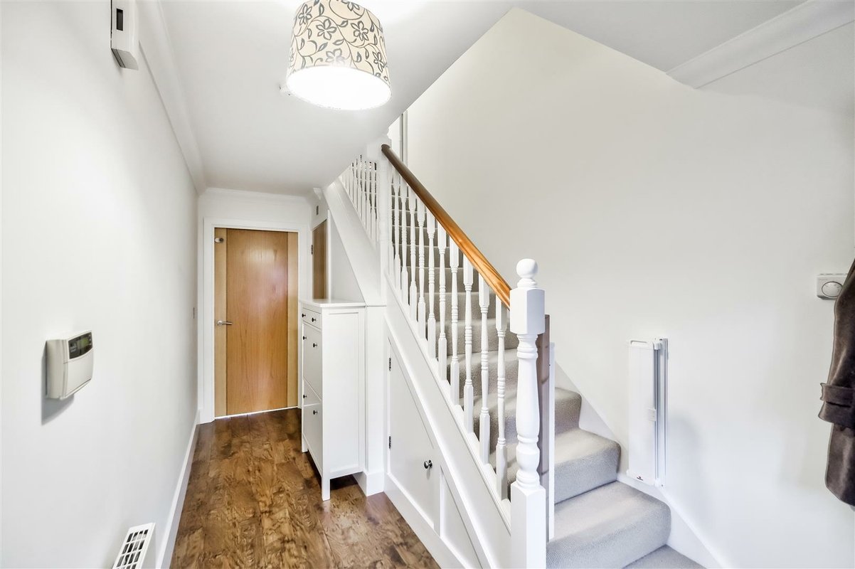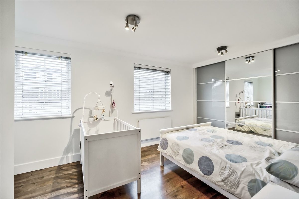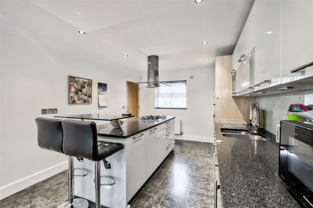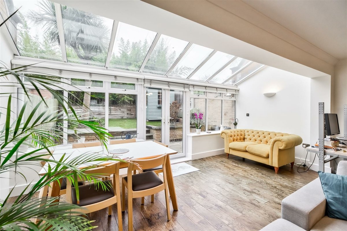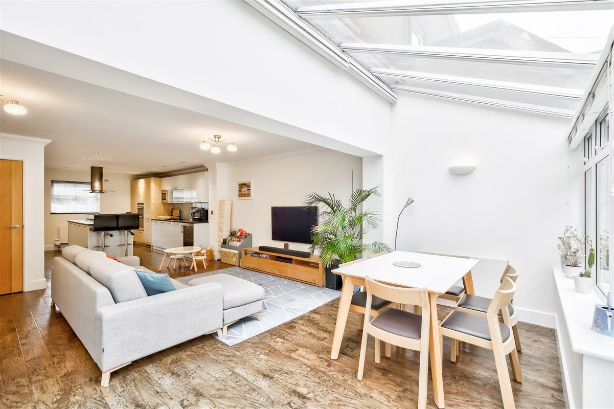 This home stands out not only for its prime location but also for its expansive living space, beginning with a large and welcoming entrance hall with a convenient downstairs WC. The ground floor is thoughtfully designed, with a combination of solid wood and tiled flooring that enhances the sense of flow and light throughout the space. The impressive kitchen/diner area spans a generous area, benefiting from a West-facing aspect that bathes the room in natural light. The space offers excellent versatility, providing ample room for a dining suite as well as a seating area or workspace. The kitchen itself is well-equipped with an abundance of cupboard and countertop space, perfect for preparing family meals. A striking glass-roofed conservatory at the rear of the room further enhances the sense of openness and light, while offering views over the well-maintained garden. The garden features a spacious patio area, ideal for outdoor entertaining and family gatherings, seamlessly connecting with the interior of the home. The first floor comprises two well-proportioned double bedrooms, both serviced by a modern family bathroom. The second floor is dedicated to the impressive principal bedroom, which has been thoughtfully designed to make the most of every inch of available space with a dedicated dressing area leads to a spacious en-suite bathroom. This luxurious en-suite features both a walk-in shower and a freestanding bathtub, all finished to a high standard with stylish tiling throughout.