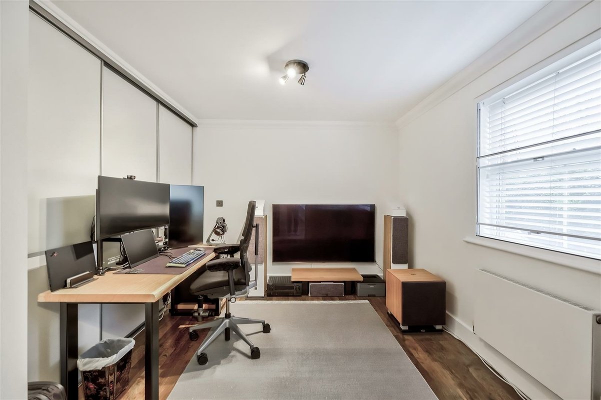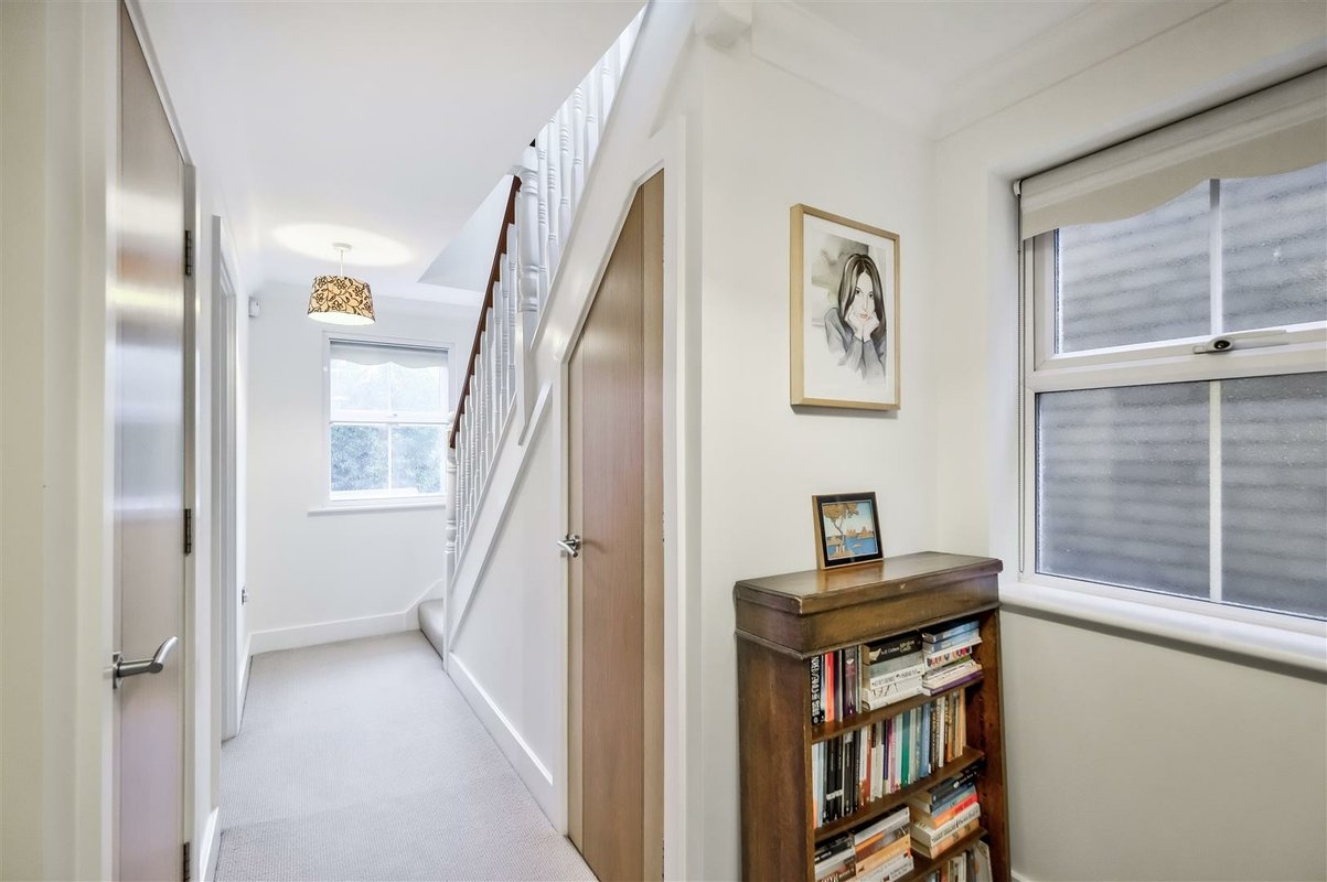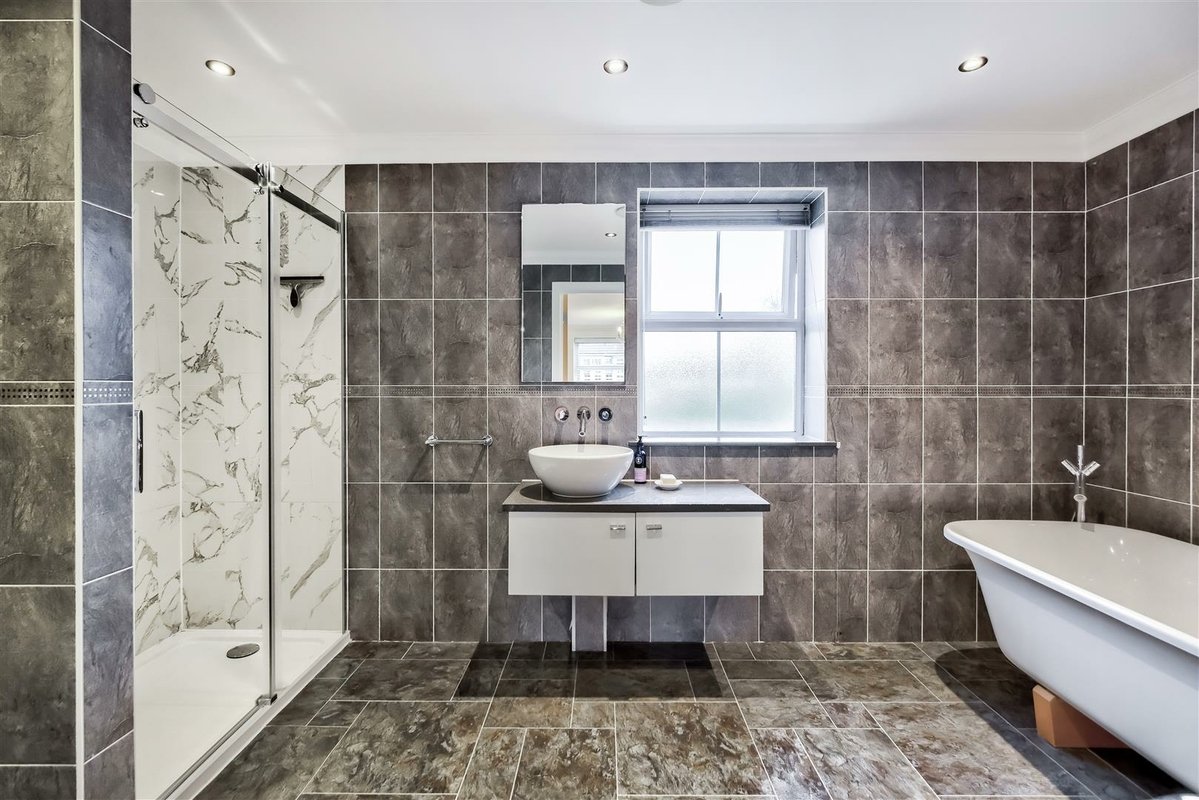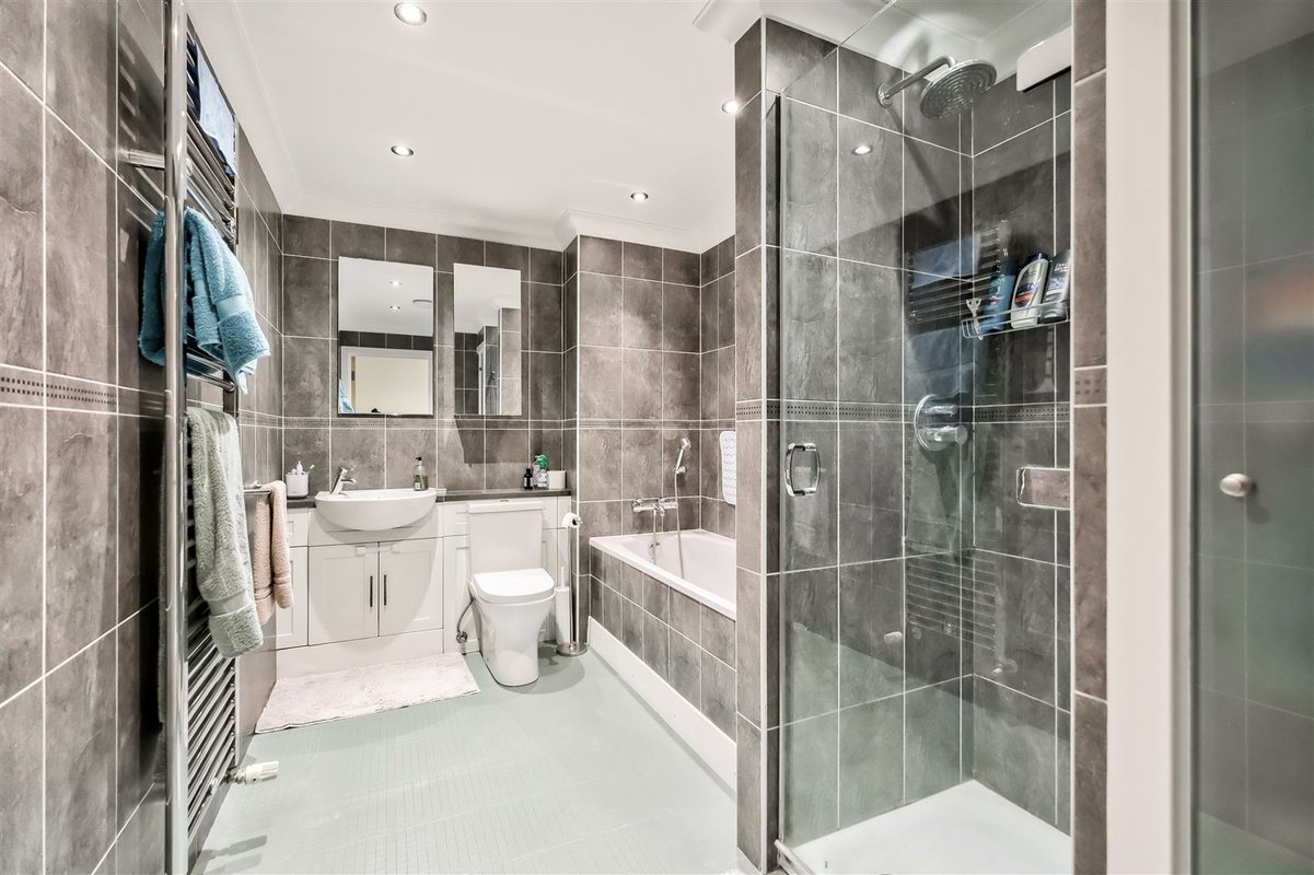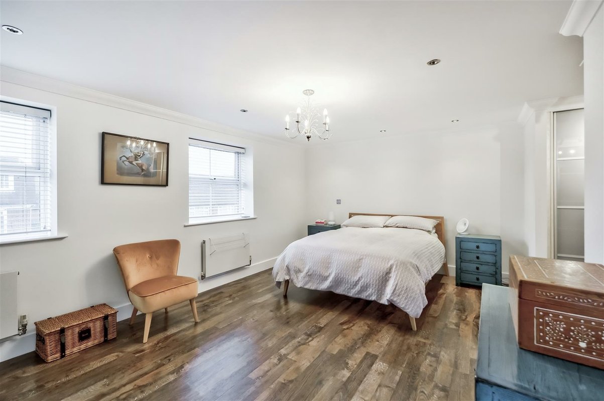 This home stands out not only for its prime location but also for its expansive living space, beginning with a large and welcoming entrance hall with a convenient downstairs WC. The ground floor is thoughtfully designed, with a combination of solid wood and tiled flooring that enhances the sense of flow and light throughout the space. The impressive kitchen/diner area spans a generous area, benefiting from a West-facing aspect that bathes the room in natural light. The space offers excellent versatility, providing ample room for a dining suite as well as a seating area or workspace. The kitchen itself is well-equipped with an abundance of cupboard and countertop space, perfect for preparing family meals. A striking glass-roofed conservatory at the rear of the room further enhances the sense of openness and light, while offering views over the well-maintained garden. The garden features a spacious patio area, ideal for outdoor entertaining and family gatherings, seamlessly connecting with the interior of the home. The first floor comprises two well-proportioned double bedrooms, both serviced by a modern family bathroom. The second floor is dedicated to the impressive principal bedroom, which has been thoughtfully designed to make the most of every inch of available space with a dedicated dressing area leads to a spacious en-suite bathroom. This luxurious en-suite features both a walk-in shower and a freestanding bathtub, all finished to a high standard with stylish tiling throughout.