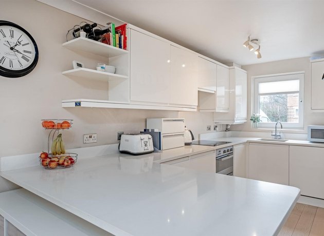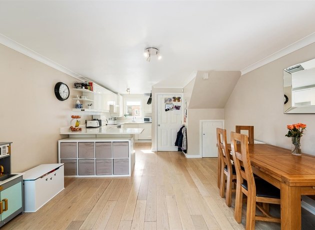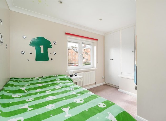 On the first floor you will find two good sized bedrooms, one with deep fitted wardrobes, the other overlooking the garden. The modern family bathroom is partly tiled, fitted with a white suite and heated towel rail. The second floor features the principal bedroom, a bright and airy room with Juliette balcony and en-suite shower room, also fitted with a white suite.
