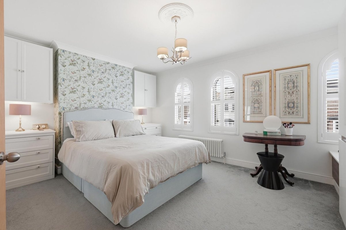 Moving to the first floor you will discover two double bedrooms, the front with three shuttered arched windows and fitted wardrobes with t.v. display unit, the rear bedroom featuring a cast iron fireplace and fitted wardrobes. The fully tiled family bathroom is simply stunning and is large enough to easily accommodate the large bathtub and walk in rainfall shower.