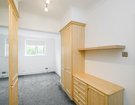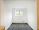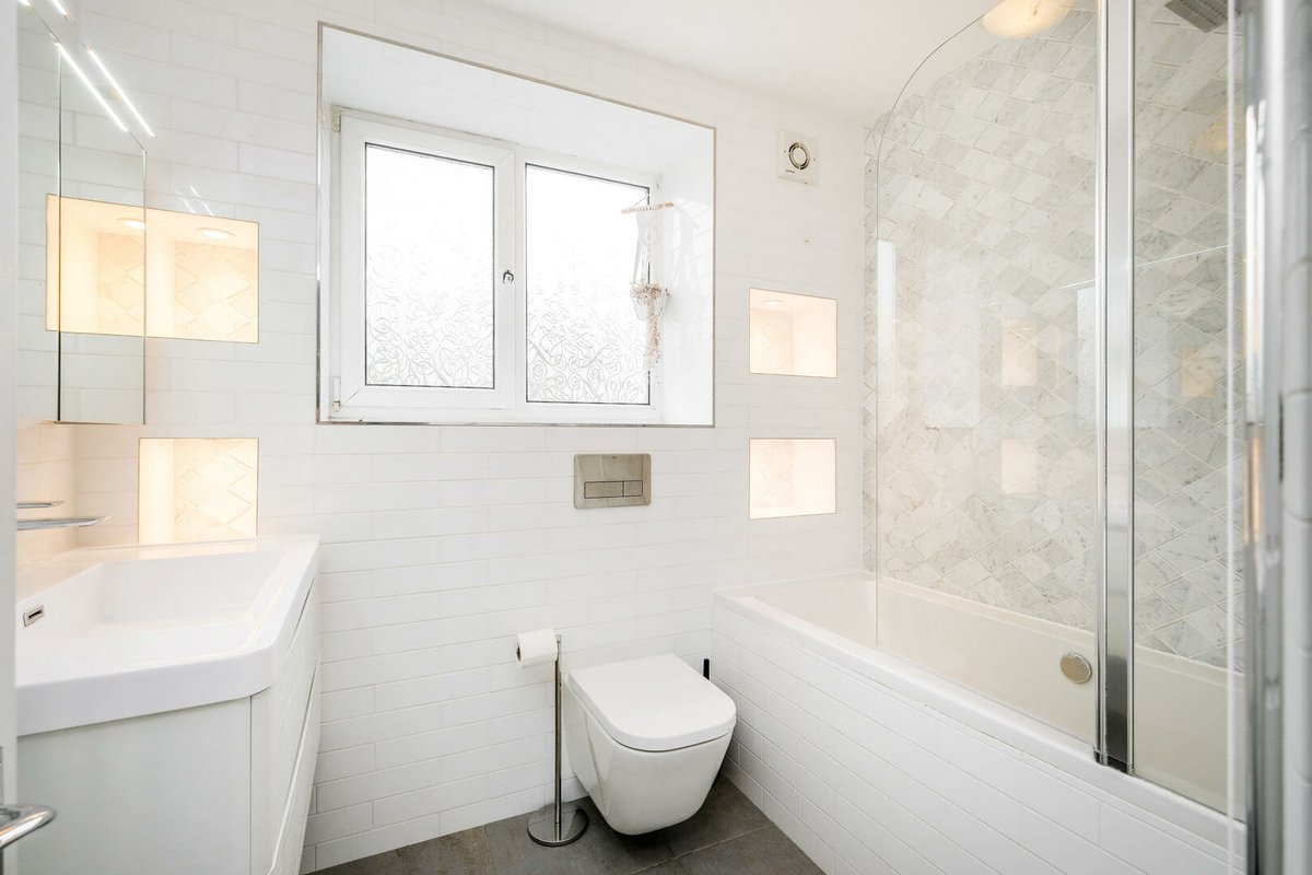 This well-presented property boasts two generously sized double bedrooms, with the principal bedroom benefitting from extensive fitted wardrobes. Both rooms are served by a sleek, fully tiled modern bathroom featuring stylish backlit recessed shelving, under-sink storage, and a mirrored wall cabinet – offering both practicality and a high-end finish.