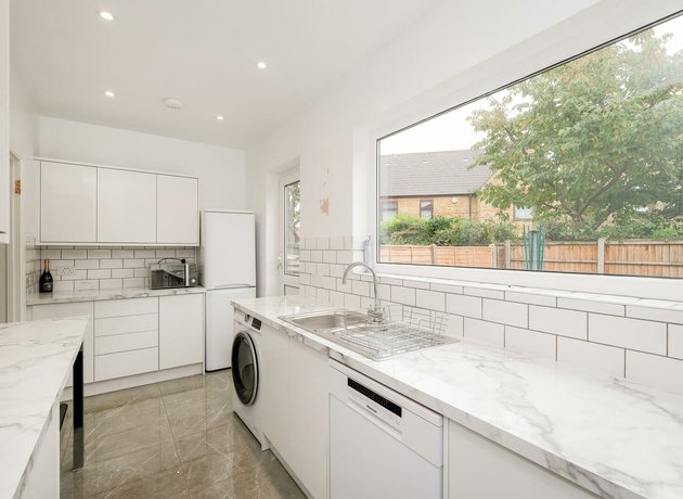 The ground floor features a spacious open-plan living and dining area, complete with practical understairs storage, ideal for coats, shoes, and bags. This flows seamlessly into a contemporary rear kitchen, bathed in natural light through a large picture window overlooking the garden. The kitchen comes fully equipped with integrated appliances including a washing machine, dishwasher, microwave, oven, gas hob, extractor fan, fridge/freezer, and built-in waste bin, along with modern combination power and USB sockets for added convenience.