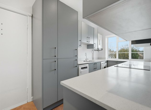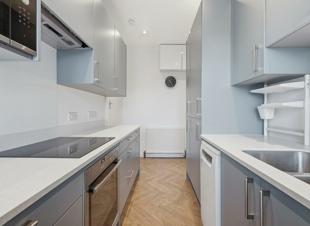 The newly installed bathroom is sleek and stylish, featuring a walk-in shower and striking black-and-white mosaic vinyl flooring. The contemporary kitchen is fitted with soft blue units and crisp white worktops, complemented by the continuation of the parquet flooring. A second access point from the kitchen provides convenient direct access to the bin storage area.