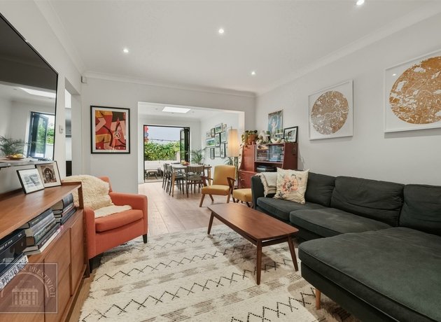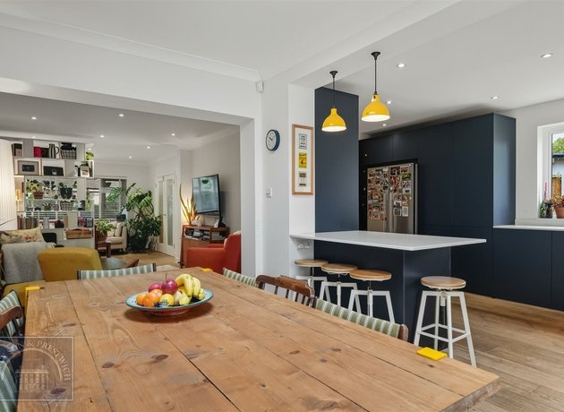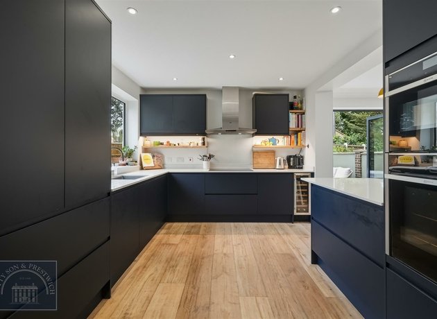 A statement 24-ft lounge welcomes you in, cleverly zoned with open shelving to create defined areas for relaxation or play. This leads seamlessly through a wide archway to the dining area, bathed in natural light thanks to an overhead skylight and full-width bi-fold doors framing views of the garden. Push the doors back and step onto a generous wrap-around patio, bordered by lawn, mature planting and gated side access; an enticing space with clear scope for future enhancements (STTP).