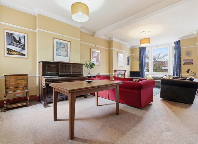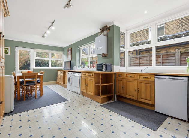 Inside, the beautifully proportioned through lounge and dining room is bathed in natural light from its double aspect windows, including a striking bay to the front. Original features enhance the sense of heritage, including a characterful fireplace with delicate pastel tiled detailing, complemented by picture rails and dado rails that pay homage to the home’s Victorian origins. The room provides an elegant yet comfortable setting, perfectly suited to both relaxed family living and refined entertaining.