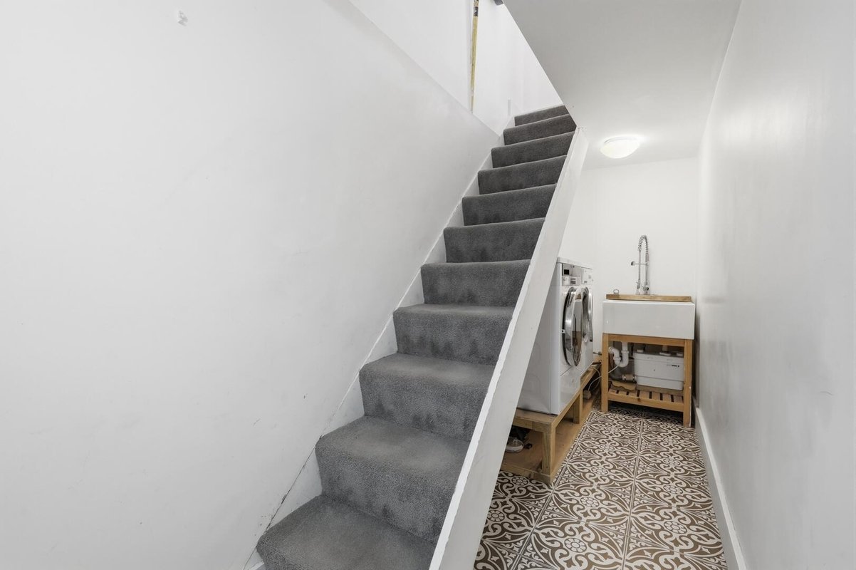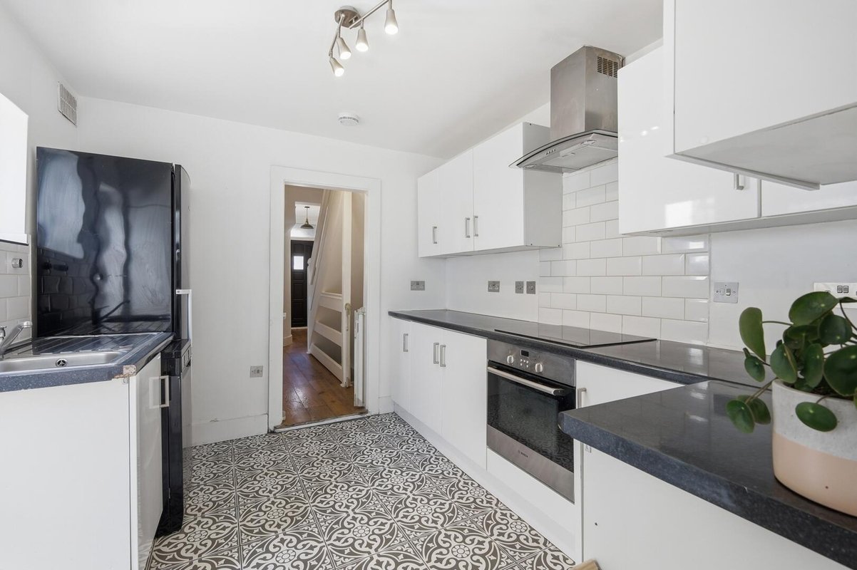 Externally, the home showcases the classic character associated with Victorian properties, featuring attractive brickwork, striking double bay windows, a charming porch, and elegant wrought iron fencing, creating an impressive first impression. Inside, the spacious through lounge/dining room is beautifully finished with rich wood flooring, complemented by crisp white walls. The double-aspect layout, including the bay window, floods the space with natural light, while plantation shutters add a timeless and stylish touch throughout the home. The kitchen is both practical and stylish, offering an abundance of white cabinetry contrasted with sleek black worktops and a striking black-and-white mosaic floor, which continues seamlessly into the contemporary ground floor bathroom. The current owners have thoughtfully developed the basement, tiling the space to create excellent additional storage and a separate utility area, which is ideal for keeping appliances neatly tucked away.