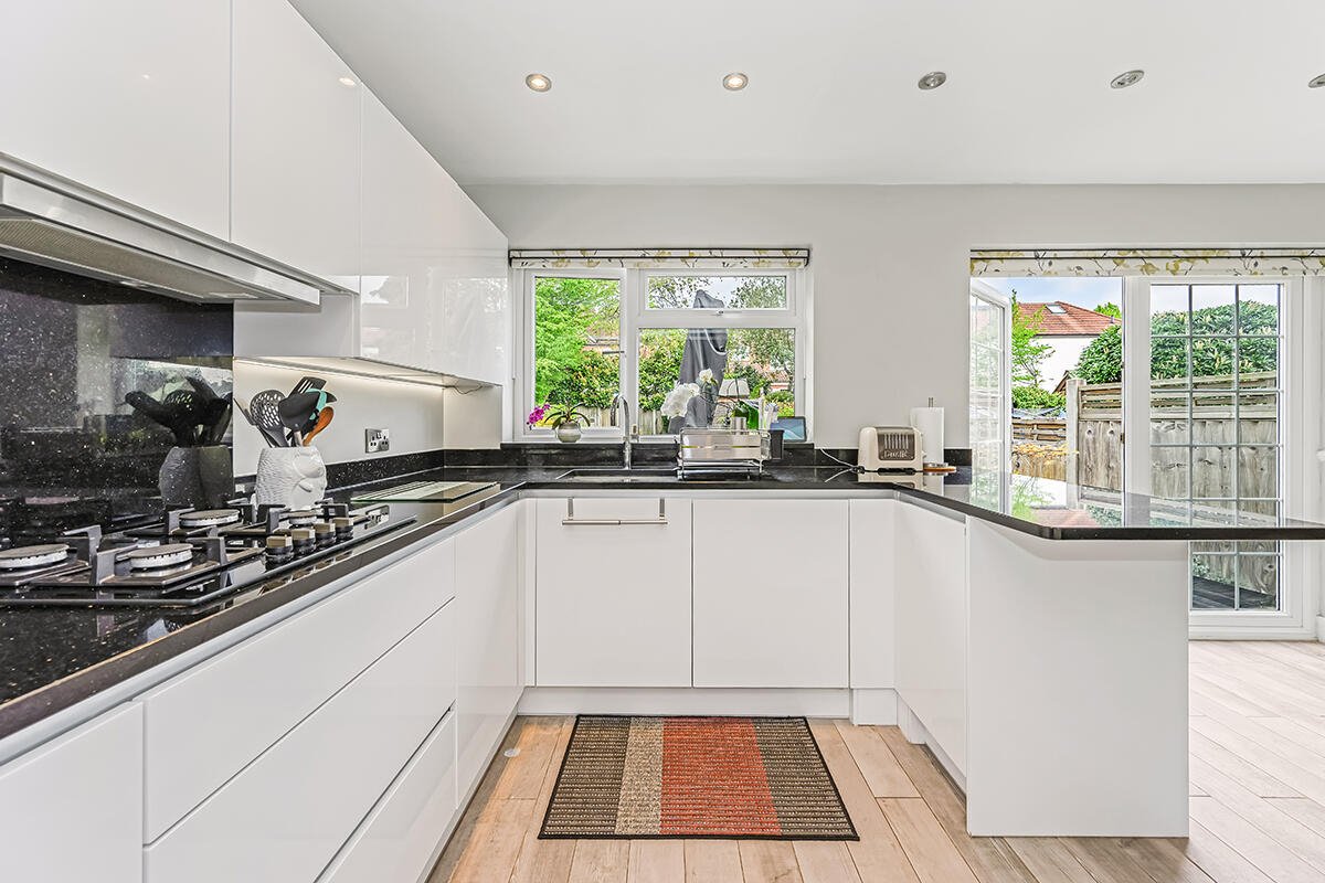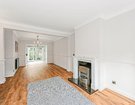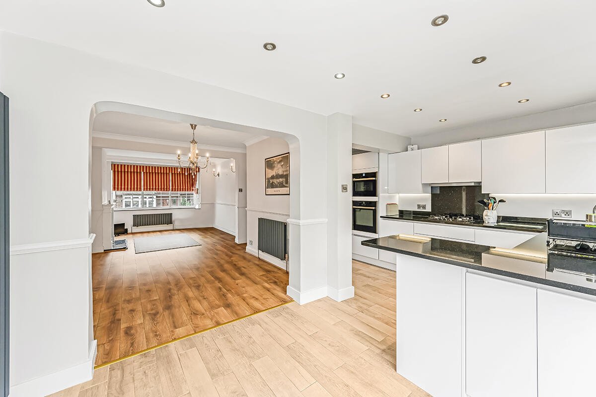 The ground floor offers an extremely generous lounge spanning an impressive 23’11 in depth with an archway leading to a kitchen/dining room to the rear. The sleek kitchen provides plenty of storage, and a peninsular island area connecting the kitchen and dining space and a breakfast bar for casual dining. Integrated appliances include a gas hob, extractor, dishwasher, oven and grill.